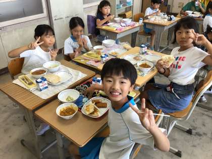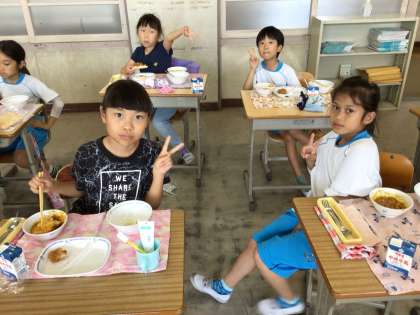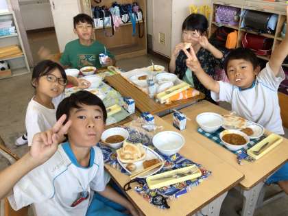 給食の時間の途中からもぐもぐタイムになり、静かに食べています。毎日美味しくいただいています。ご馳走様でした。