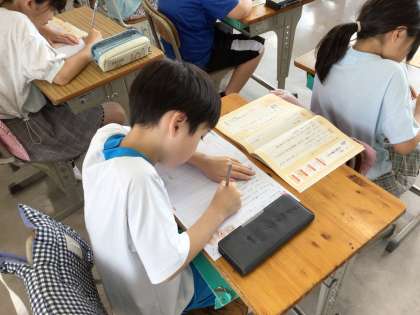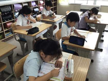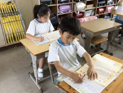 1組の授業です。えんぴつを使って手紙の書き方の練習をしました。