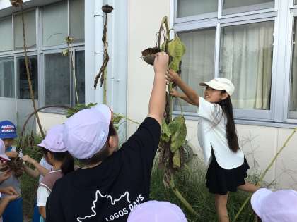 3組の授業です。花が咲いた後のヒマワリ、オクラの様子を観察しました。ヒマワリの種の中にいた虫を発見しました。