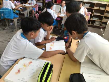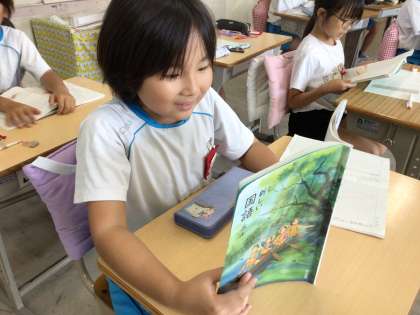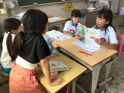 夕日がせなかをおしてくるを朗読しました。班の中で朗読がよかった友だちを1人決めて、みんなの前で発表しました。