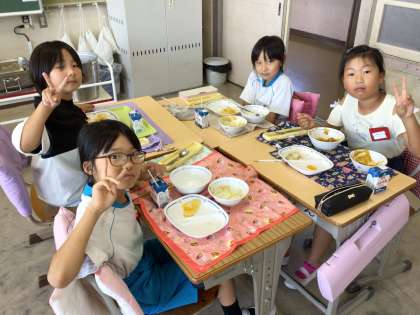 この日のメニューは、麦ごはん、夏野菜のカレー、いかサラダ、なしポンチ、牛乳でした。なしが好きな子が多かったです。カレーの日は、ご飯が足りなくなります。