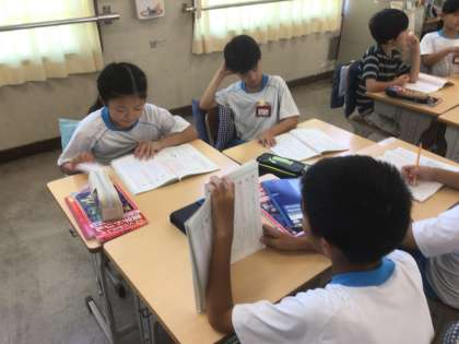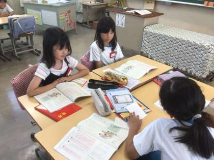 「グループの合い言葉をきめよう」の学習です。話し合いの進め方を知るために、グループで司会を立て、練習しました。