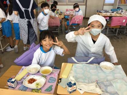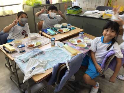給食当番の配膳が早かったです。笑顔で食べていました。