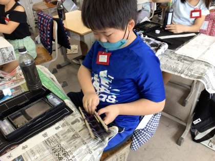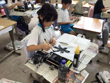 書写では、毛筆を使って「木」を練習しました。右に払うところに気を付けながらゆっくりかいていました。