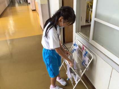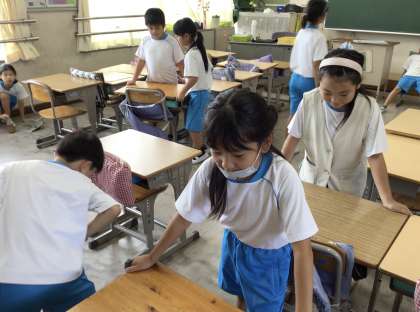 3組の教室掃除のです。机や椅子を持ち上げて運んでします。雑巾の整頓もしていました。