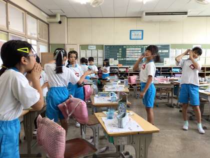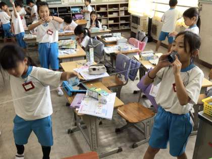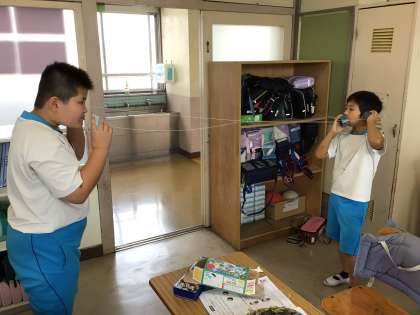3組も糸電話を使って実験を行いました。糸にスパンコールを通して、声を出したいときの糸の震え方を調べました。
