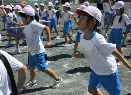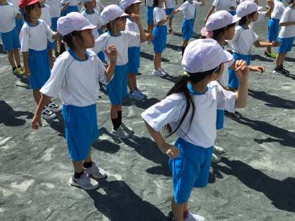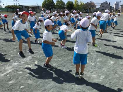最初に準備運動を行いました。天気もよく元気よく動いていました。