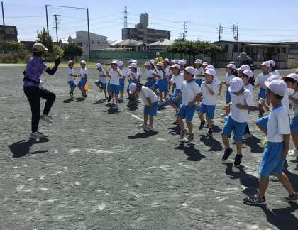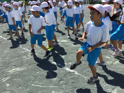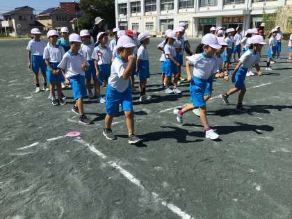 50mをより早く走るための練習をしました。早く歩いたり、太ももを高く上げたりしました。