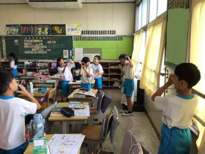 教室で、3人以上でも糸電話で会話ができるかどうか実験で確かめました。