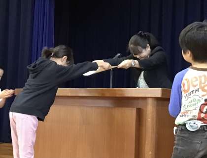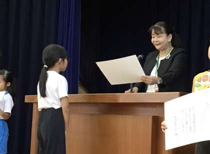今日、前期終業式の前に表彰式が行われました。夏休みに取り組んだ生活作文、詩、読書感想文で3人の3年生が表彰されました。