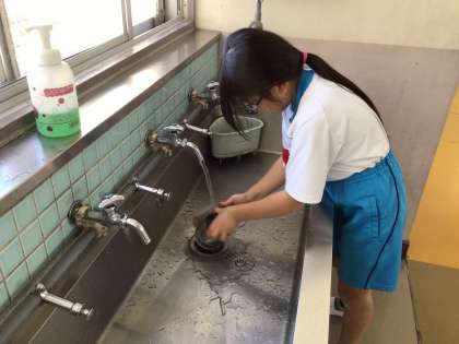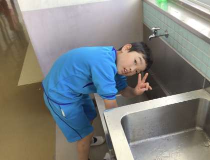 手洗い場とトイレの掃除です。手洗い場の排水口やトイレの床もたわしや雑巾で丁寧に綺麗にしています。