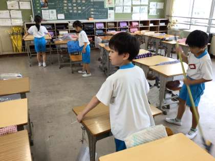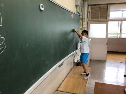1組の教室です。広い黒板も隅々まで綺麗にしています。