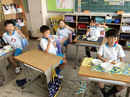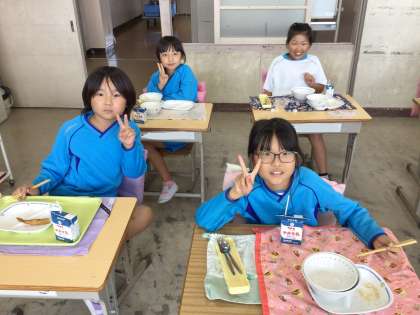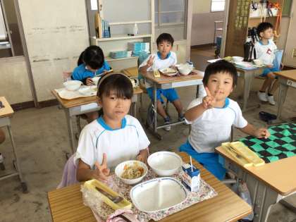この日のメニューは、とよためん、野菜あん、ししゃもフライ、和風サラダ、牛乳でした。とよためんが大人気でした。和風サラダも残さず食べました。