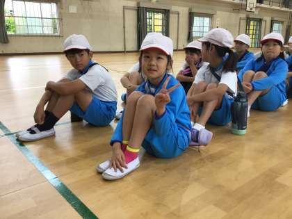 2時間目は、1組と4組が体育館で授業を受けました。