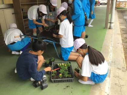 そよ風さんに教えてもらいながら、ビオラやパンジーの苗をポットに植え替えました。大きく育ったら、次は花壇に植えます。