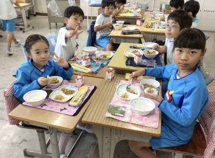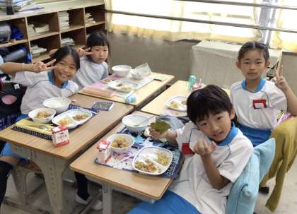 この日のメニューは、ごはん、肉じゃが、納豆あえ、ごまずあえ、手巻きのり、牛乳でした。納豆好きな子が多くいます。手巻きのりも大人気です。