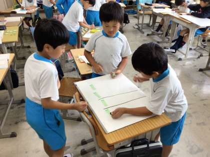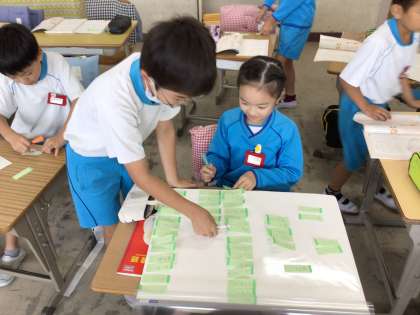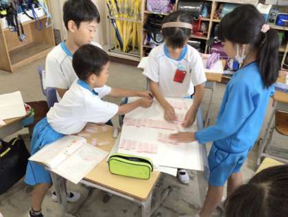 分けるです。班ごとに好きなものグループ分けしています。グループ分けをした後に発表会をしました。