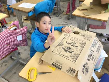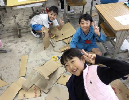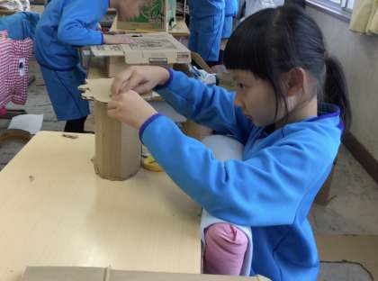 ダンボール紙を切ったり貼ったりして立体的な作品を作っています。