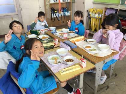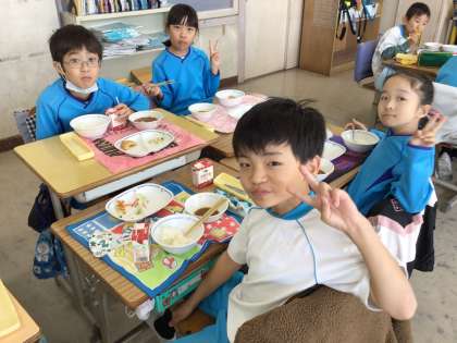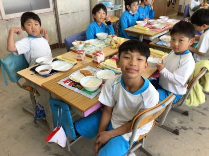 この日のメニューは、ごはん、とよたひまわりポークのあかだし、青菜和え、とよた産じゃがいもコロッケ、おにまんじゅう、牛乳でした。とよた産じゃがいもコロッケとおにまんじゅうがとても人気がありました。