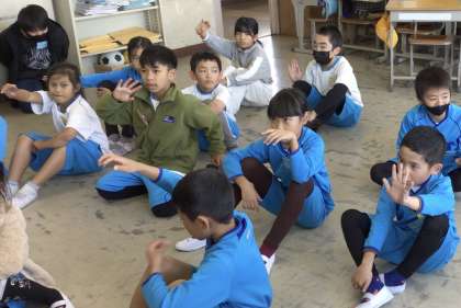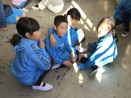 今回は、指示された人数でグループを作る遊びを行いました。違う学年の子ともグループを作り、大いに盛り上がりました。
