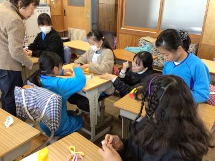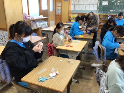 最終日の今日は、もう一つ。牛乳パックを活用して、笛を作りました。サイコロみたいな作り方で、音が鳴る笛に鳴りました。鳴ると嬉しかったですね。