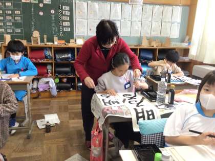 書写ボランティアの先生に書き初めの指導をしていただきました。児童は真剣そのものでした。