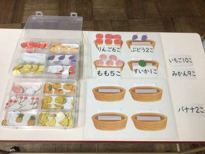 問題カードに書かれた数の果物を正しくかごに入れる