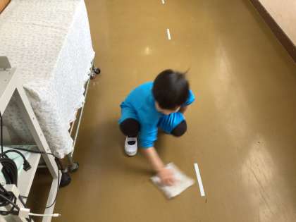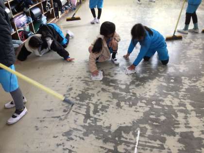 寒さをこらえて、雑巾掃除を頑張っています。いつもきれいにしてくれてありがとう。