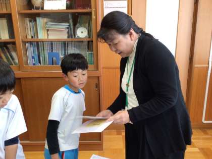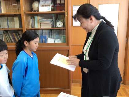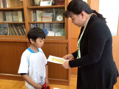 普段から元気がよく笑顔の絶えない3年生もかがやき賞をいただくときは真剣な表情です。