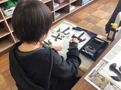 書き初めを行いました。 紙を墨で汚さないように気を付けながら、取り組みました。