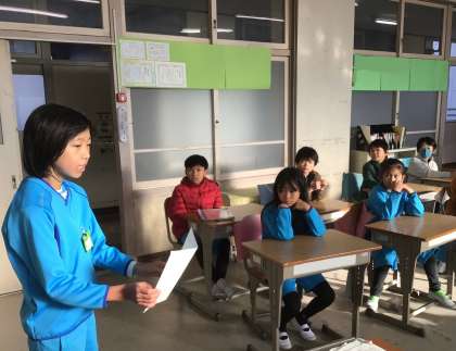 今朝は、V.S委員の5年生が、明日から始まるお年玉募金の呼びかけに来ました。分かりやすい5年生の説明をうなずきながら聞いていました。
