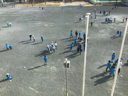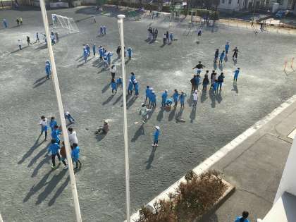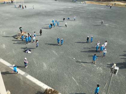 全校で運動場いっぱいに広がって長縄跳びの練習をしています。