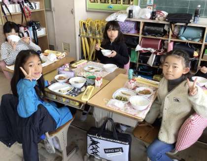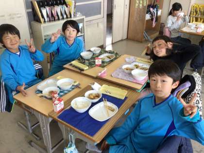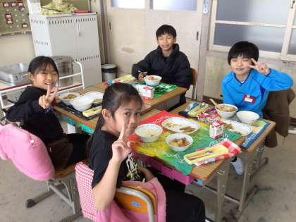 この日のメニューは、ごはん、肉じゃが、いりだいずあえ、わかさぎのからあげ、牛乳でした。肉じゃがを大好きな子が多いです。
