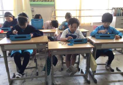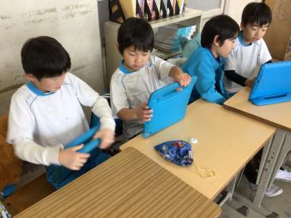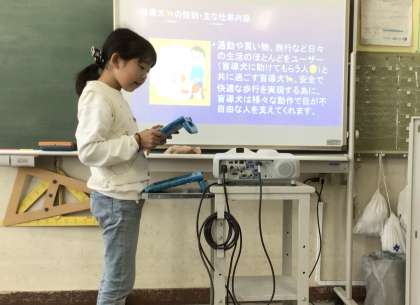 調べたことをまとめ終わった班は、プロジェクターを使ってスピーチの練習をしています。緊張すると早口になるのでゆっくり話すことを意識して練習を進めています。