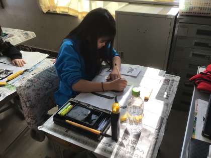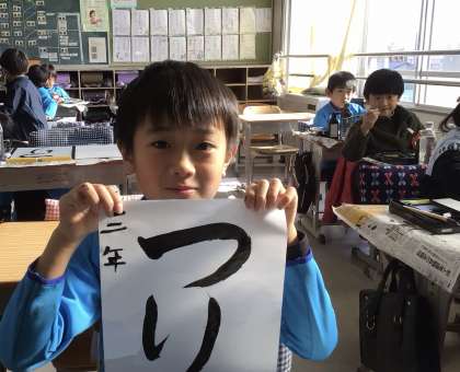 毛筆で「つり」をかいています。静かに集中して練習しています。