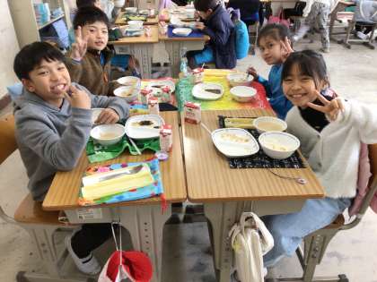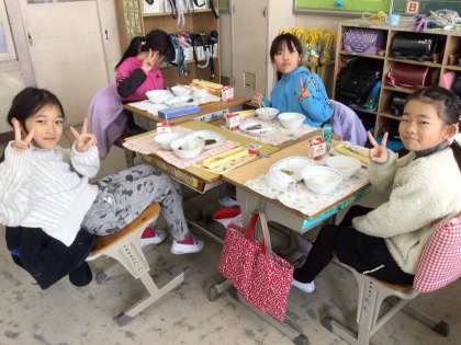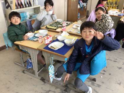 この日のメニューは、ごはん、粕汁、ほうれんそうのおひたし、いわしの梅煮、節分豆、牛乳でした。節分の話を聞きながら節分豆を食べました。粕汁、ほうれんそうのおひたしがとても好評でした。