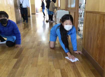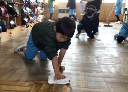 毎日、各クラス1・2名の3年生が4年生の教室で掃除しています。4年生にアドバイスをもらいながら真剣に掃除しています。