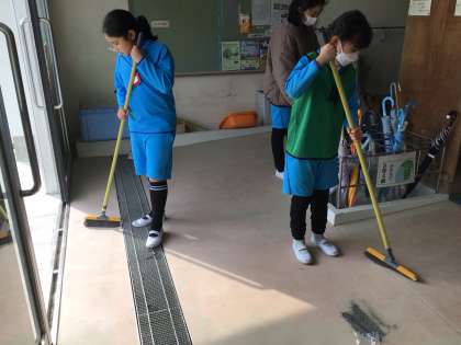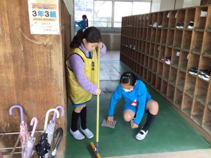 西昇降口の様子です。掃除を一生懸命頑張っている子がビブスを身に付けています。無言で綺麗にして友だちの手本となっています。
