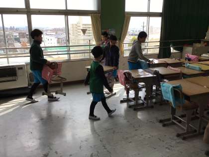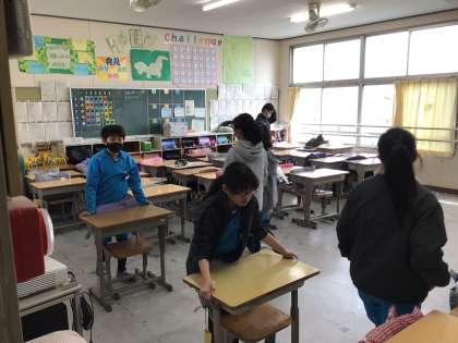 5年生教室にいき、一緒に掃除をして、高学年の掃除を体験しています。
