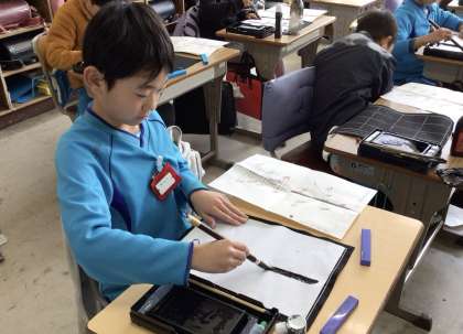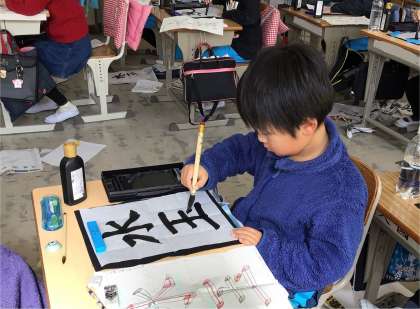 今日は毛筆の授業でした。「水玉」を一筆ずつ丁寧にかいています。