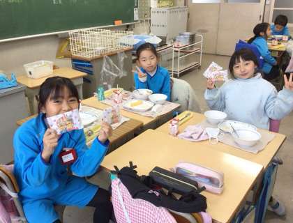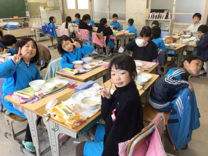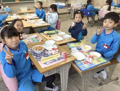 この日のメニューは、ごはん、かしわ汁、厚焼きたまご、ちらし寿司の具、ひなあられ、牛乳でした。ひなあられが1番好評でした。