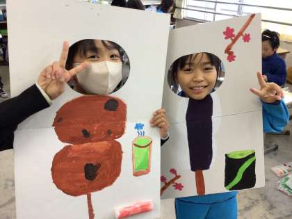 ダンボール紙に色を塗って、穴から顔を出して作品が完成します。