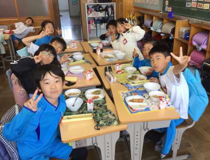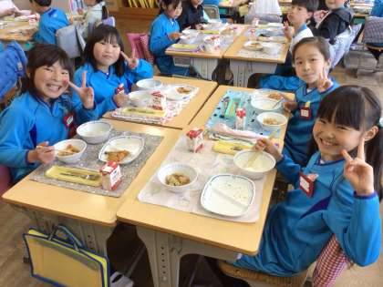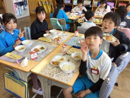 今日席替えをして、新しい班になりました。友だちと楽しく会食をして食べています。