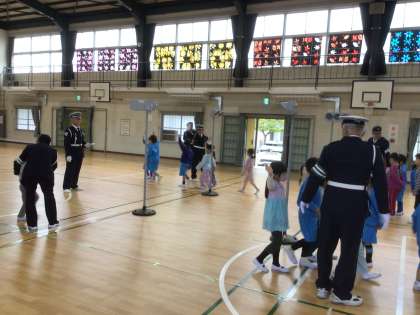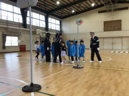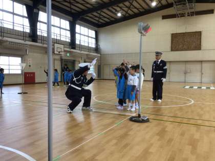 今日は、体育館に道路標識や信号を設置してもらい、安全に気をつけた道路の渡り方を教えていただきました。1年生のみんなで練習しました。