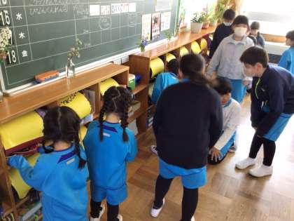 別の教室では、高学年の子が、ランドセルの上手なしまい方を1年生の子に教えていました。