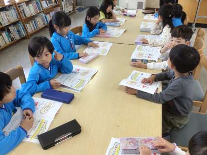 今日は、図書館に行って司書の鈴木さんに図書館の使い方や、約束を教えていただきました。「読書ノート」を使って学習を進めました。