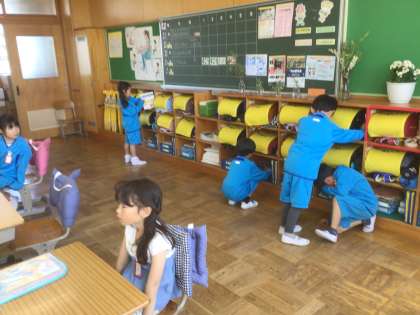 ランドセルは大ききて大変だけど、整頓を心がけてしまっています。ロッカーに荷物を入れたら、朝の会です。もう、日直さんが朝の会を進めていますよ。