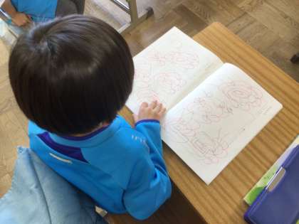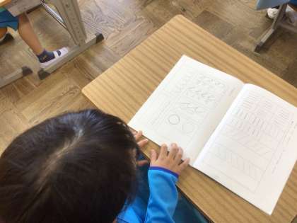 ひらがなかたかなノートを使って、字を書く前の練習中です。線を真っ直ぐ書いたり、くるくる線を練習したりしました。「今日のは難しいよ〜」という声が聞こえてきましたが、時間いっぱいがんばりました。