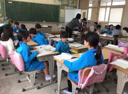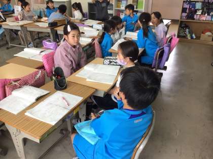 班で、ナレーション、ラッパの音、アリの声、カエルの声の4つの役に分かれて音読します。
