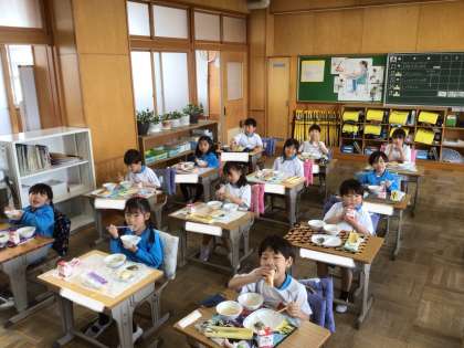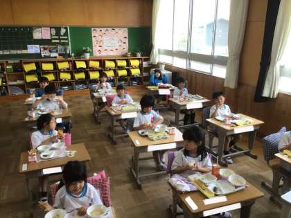給食の時間です。みんなでおいしくいただいています。